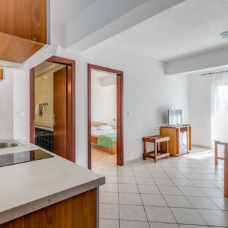 Mezonetový (2-patrový) apartmán A6+2 až pro 8 osob - nachází se v podkroví na dvou patrech, v dolním patře apartmánu je prostorný obývací pokoj s kuchyní, samostatná 2-lůžková ložnice, jídelní stůl, koupelna se sprchou a WC, balkón, po shodech dojdete do druhého patra, kde jsou 2 oddělené, ale průchozí ložnice, každá s oknem a 2 lůžky. V zadní ložnici je vchod do další koupelny a WC a také vstup na střešní terasu odkud je nádherný výhled na letovisko, moře i hory. V galerii na 1. patře se pak ještě nachází rozkládací gauč pro 1 nebo 2 osoby. Ideální pro větší rodiny nebo přátele. Samozřejmostí je vybavená kuchyň s chladničkou a mrazákem, 2-plotýnkový vařič, dřez, mikrovlnná trouba, rychlovarná konvice a všechny kuchyňské potřeby. Apartmán má 2 klimatizační jednotky (použávání je zahrnuto v ceně), Wi-Fi.
